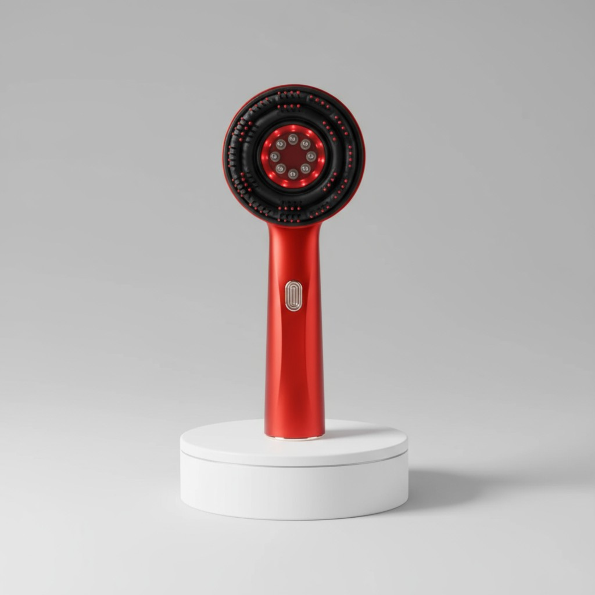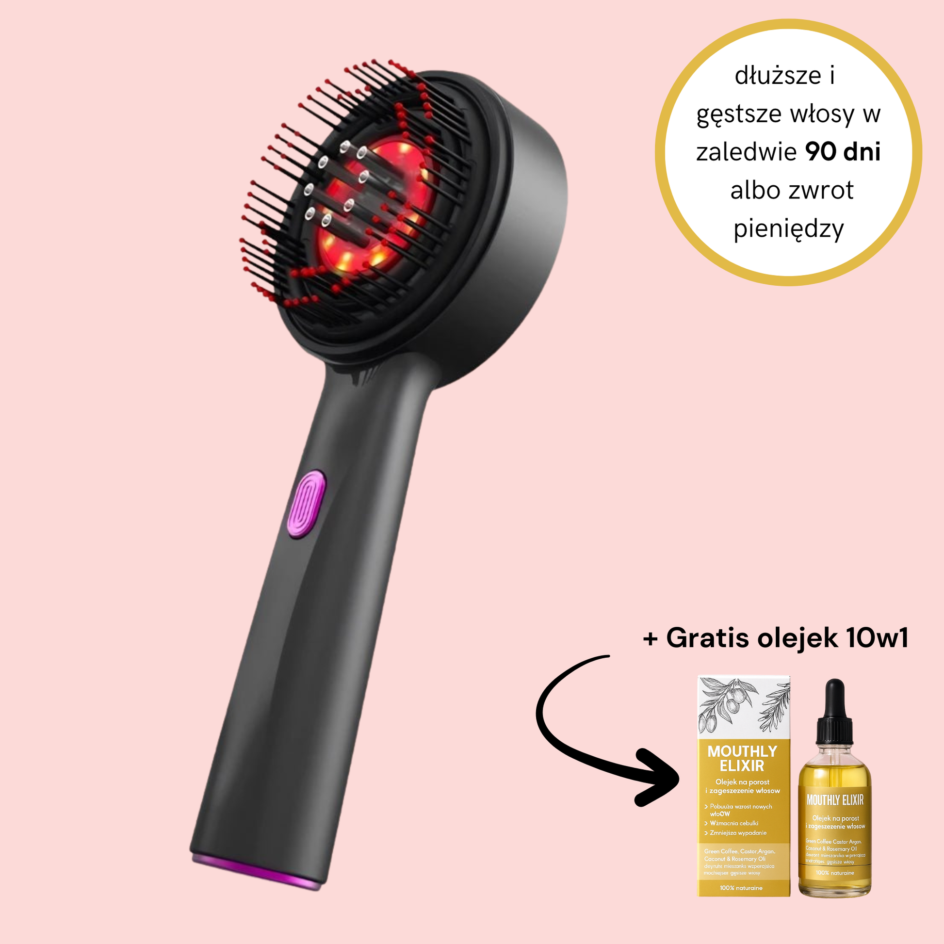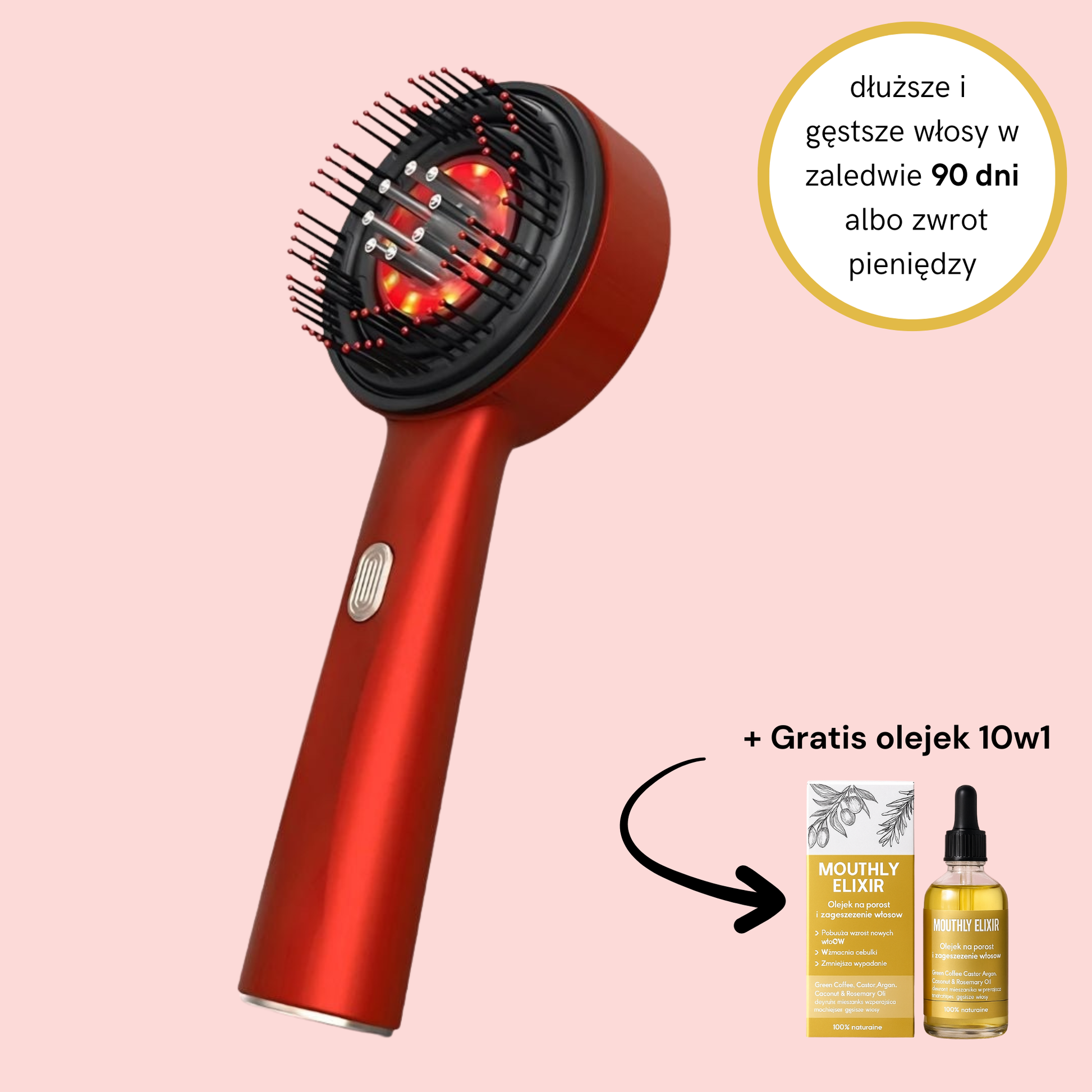 Nasza Mouthly 3w1 szczotka do masażu skóry głowy łączy czerwone światło, masaż oraz naturalny olejek 10w1, aby wspierać porost włosów, rozluźniać napięcia i pobudzać krążenie.